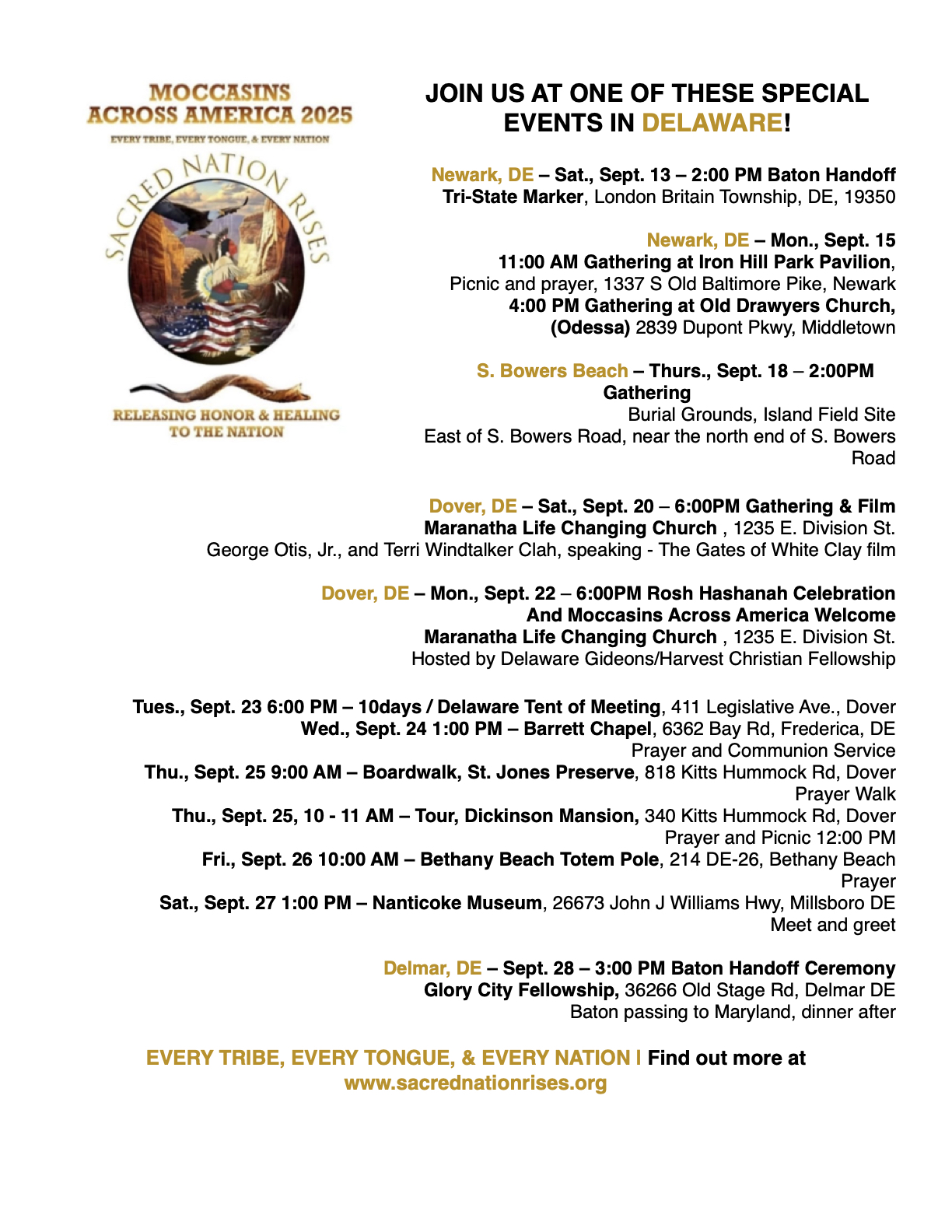 Apostle Herb & Joy Clendaniel are serving as the Delaware coordinators for this historic walk across America which begins May 3, 2025 and ends in Washington DC in October during the feast of Tabernacles. For more details visit www.sacrednationrises.com. Bringing healing and restoration to our land and people!